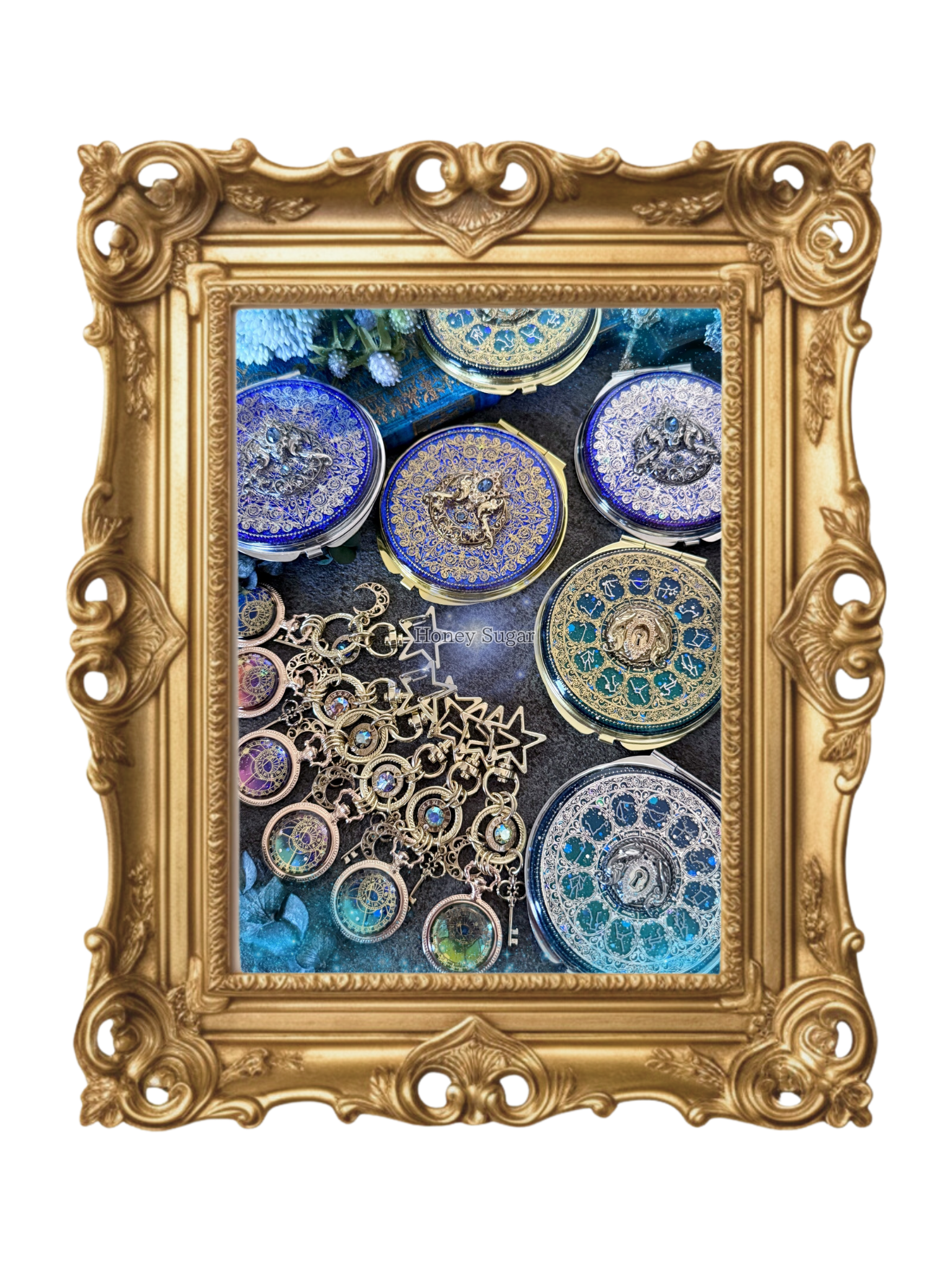 星々の記憶を映し出す星の万華鏡。 魔術具店の店主が長い時間をかけ、星影の泉の水で鏡面を満たし、星々の記憶を呼び起こす古い魔法をそっと封じた。 永い時を生きる星たちの記憶は、鏡の奥で無限の変化を見せる。 その輝きは、一瞬ごとに姿を変える、儚くも美しい芸術作品のようだ。 …*☆*…………………………………………………………………………… 箔押しのデザインを楽しんで頂きたいと制作したコンパクトミラーです。 普段の箔押しよりも繊細な模様を沢山使用して出来た万華鏡のようなデザインになっています。 存在感のあるサイズの箔押しなのでホログラム箔の煌めきがとても美しいです。 色んな角度から星の煌めきをお楽しみ下さい。 ※こちらの作品は宅急便コンパクトにてお届けいたします。 (送料は作品の金額に含まれております。) ◆カラー:全2色 →Gold →Silver ◆サイズ →コンパクトミラーの円部分の直径約72mm ◆スワロフスキーのカラー →デニムブルー ◆発送までの目安:決済確認後2週間以内 ⚠購入の際の注意点⚠ ◎作品は一つ一つ心を込めて制作しております。ですが手作業の為、グラデーションやホログラムの量、パーツの配置等につきましては写真と全く同じには出来ません事をご了承願います。 ◎高品質な黄変しにくいレジンを使用しておりますが、長くご使用頂く為にも高温及び紫外線の当たる場所は避けて保管願います。 ◎注意して制作しておりますが、埃や指紋が付着していたり、レジンを使用した作品には気泡が含まれている場合がございます。 ◎海外製の素材やパーツは初期傷や汚れ、変色がある場合がございますのでご了承願います。 (著しくひどいものについては検品段階で取り除いております。) ◎ハンドメイド品につき、取り扱い方によっては破損してしまう場合がございます。強度にも配慮して制作しておりますが、丁寧にお取扱い頂けますよう宜しくお願い致します。 ◎作品の販売価格につきましては、新しい制作方法の導入やパーツの値上げ等により見直す場合がございます。長く制作活動を継続していく為、そしてより良い作品をお届けする為にもご理解の程宜しくお願い致します。